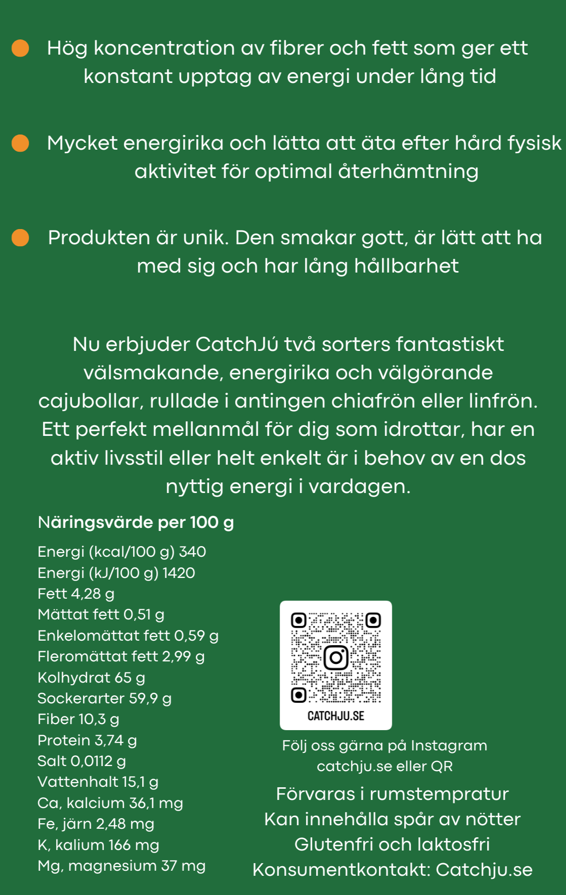CatchJú är glutenfri, laktosfri och palmoljafri. Inga tillsatta ämnen, en ren naturprodukt. Kan innehålla spår av nötter då frukten separeras från nöten vid tillverkning.